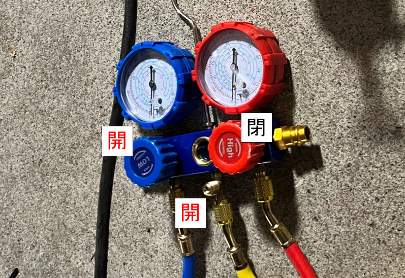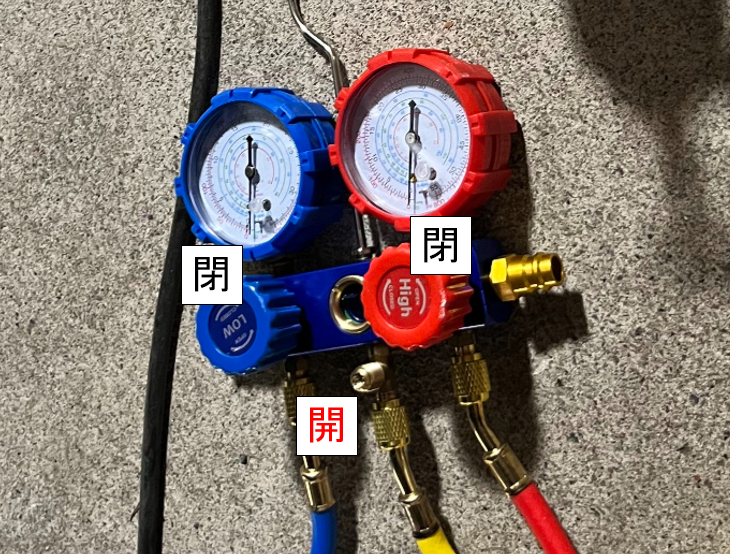 これで真空引きの準備はできたので、ゲージの高圧側(赤)、低圧側(青)、ポンプ(黄色)のすべてのバルブを開けます。