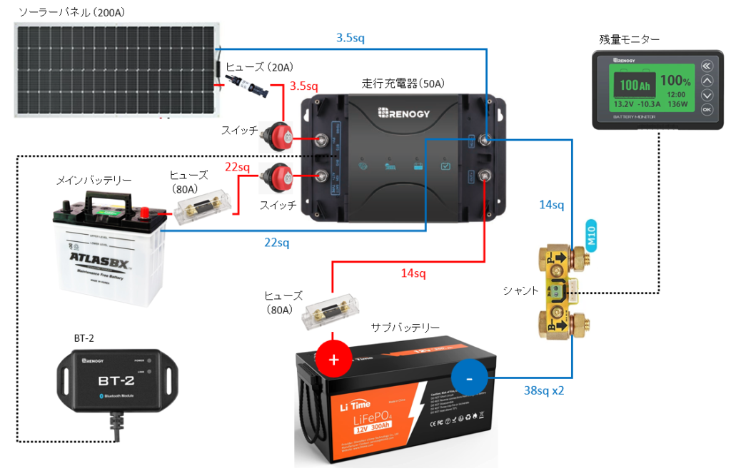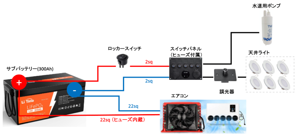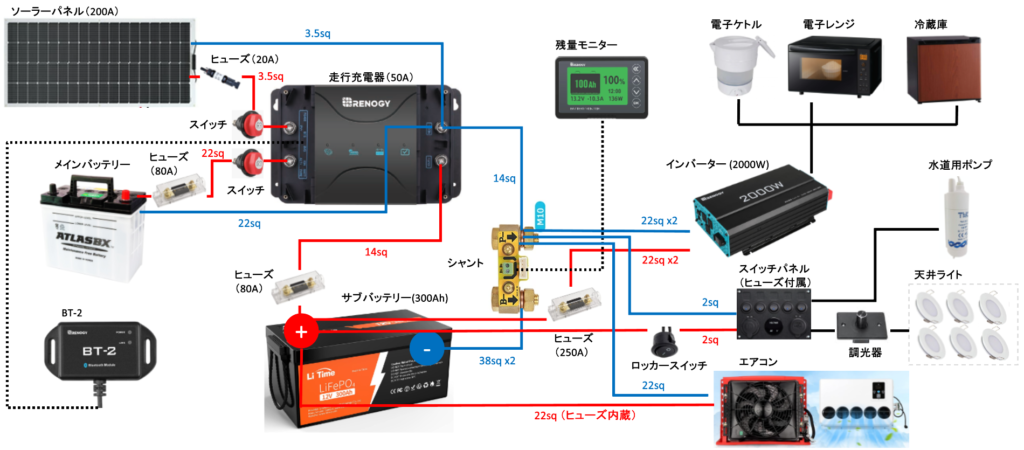 どのような車中泊を実現したいかによって必要な電化製品が決まり、おのずとそれに適した配線図が決まっていく流れになるかと思います。