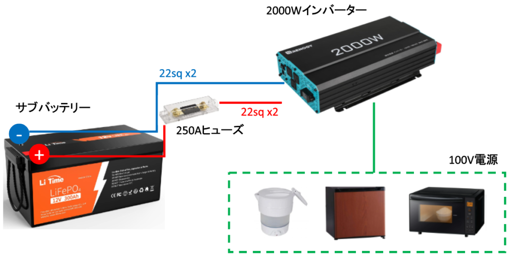 配線自体はシンプルで、サブバッテリーにインバーターをつなげプラス配線にヒューズを入れるだけです。