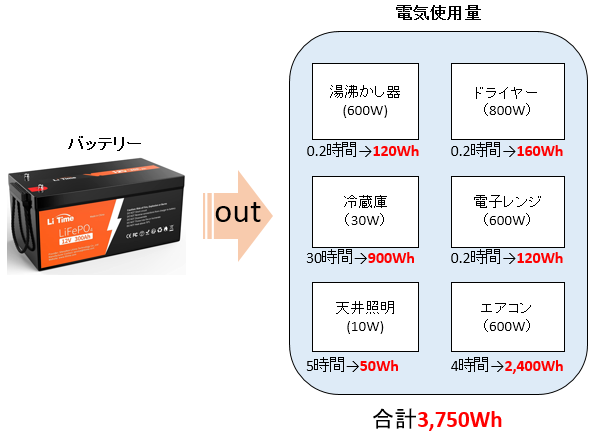 上記の各電化製品の使用量についてまとめると下の図のようになり、旅行中に合計3,750Whの電力を使用することになります。
