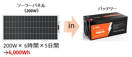 ここでは、7日間のうち5日間晴れで、晴れの日に6時間ずつ充電できたと仮定します。