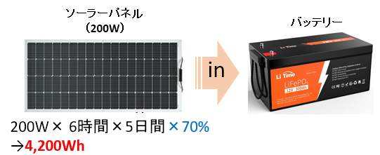 実際の充電効率を考慮に入れた結果、200Wソーラーパネルの1週間の発電量は4,200Whと見積もられました。