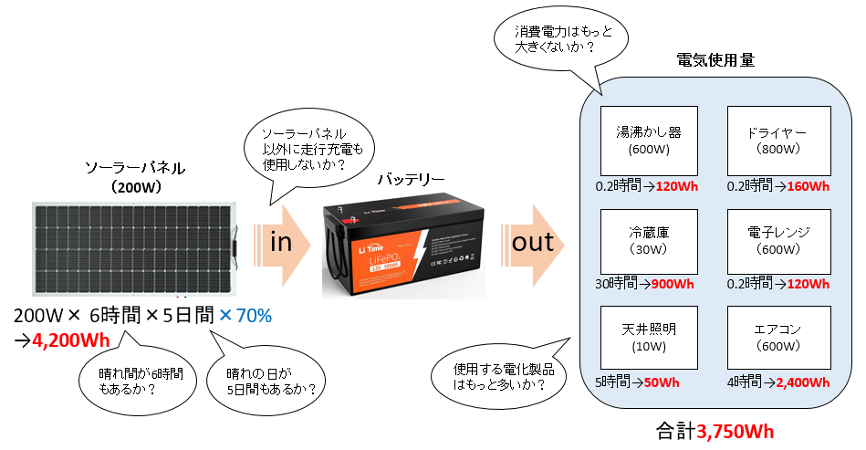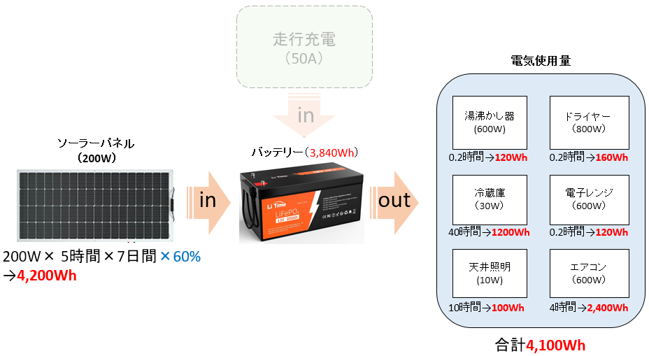 消費電力と発電量の検討結果をまとめると、消費電力3,750Whに対して発電量が4,200Whなので、ソーラーパネルの発電によって車中泊時の使用電力が賄える計算になります。