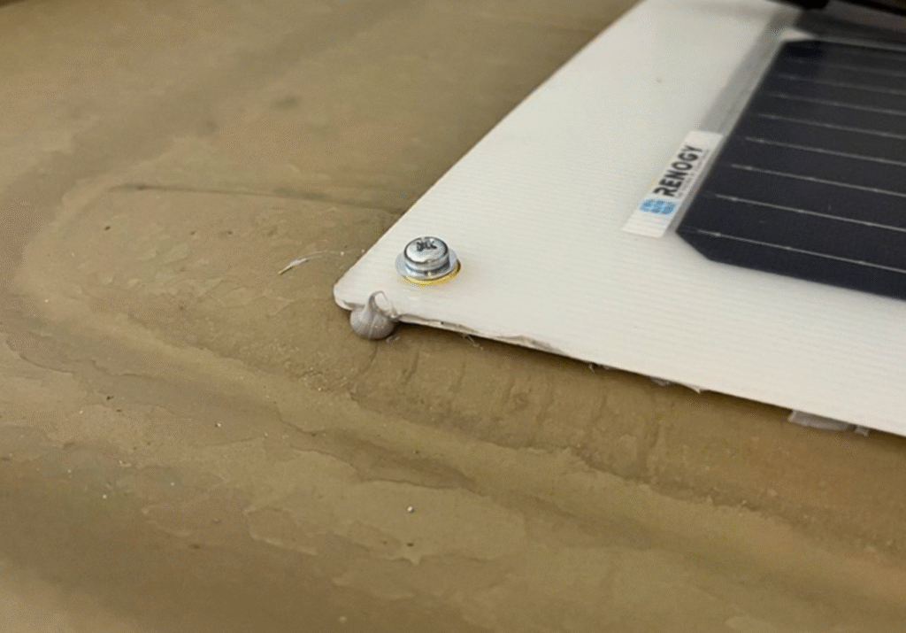 接着剤をソーラーパネルメーカーの指示通りに塗布したうえで、万が一走行時にソーラーパネルが吹き飛んだりしないようにルーフとボルト締結する方法です。