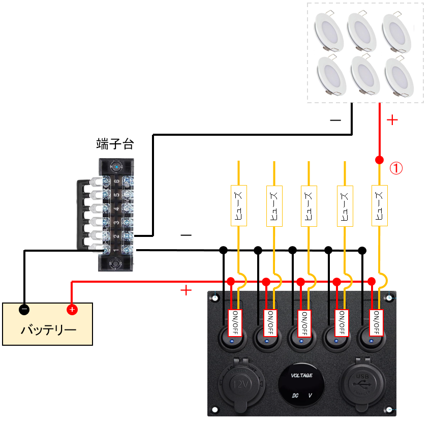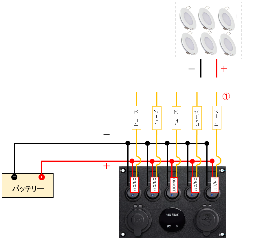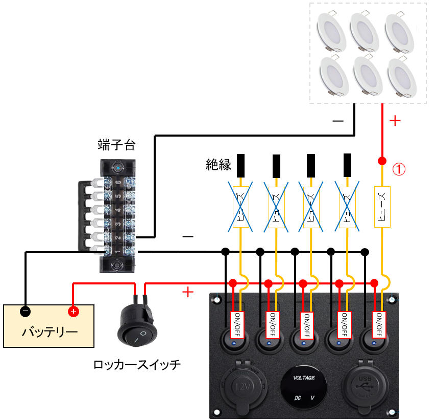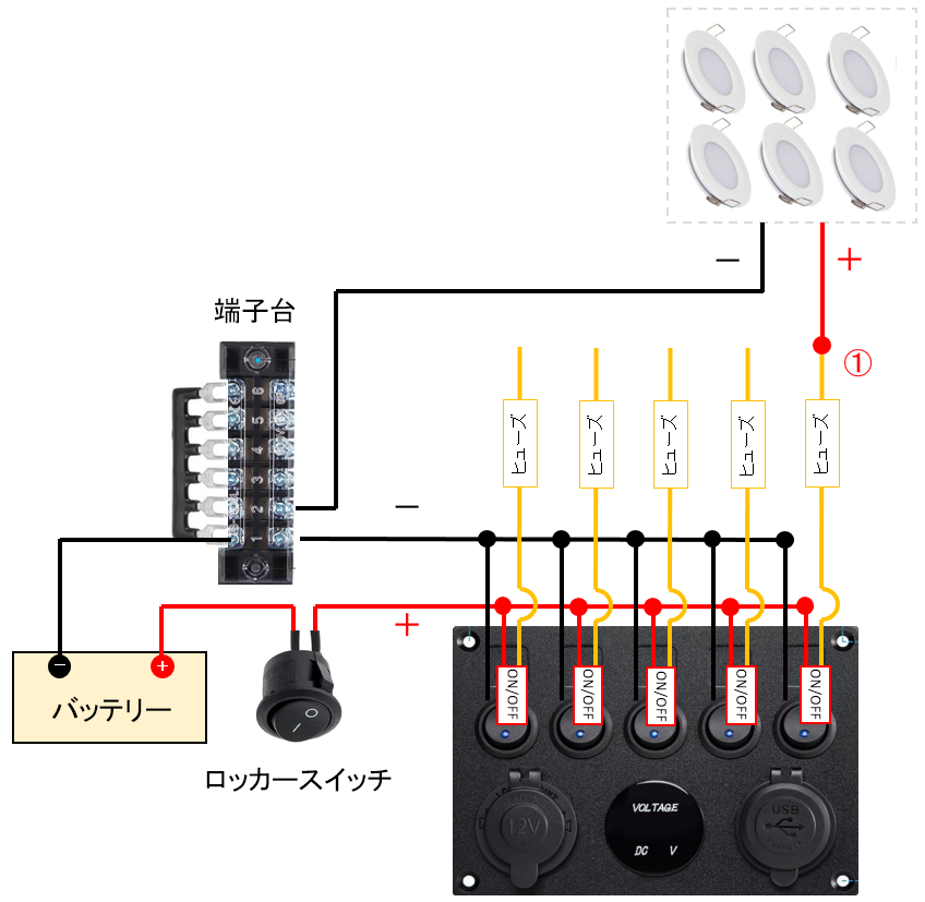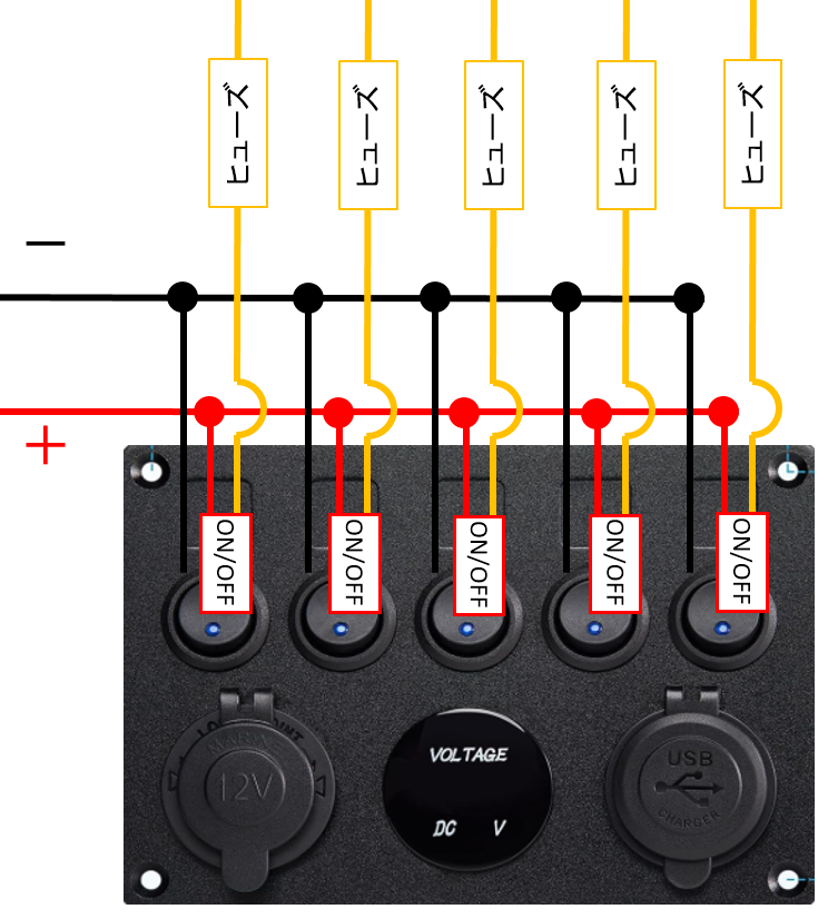 ロッカースイッチの取り付けは簡単で、下図のようにスイッチパネルのプラス配線の途中にロッカースイッチを接続するだけです。